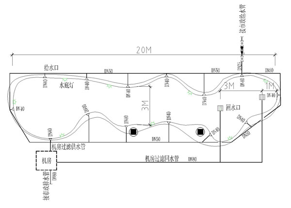 ⑦泳池補水與池底吸污相結合,吸池底出水可用來沖洗庭院,澆灌植物等,做到了節(jié)約用水。