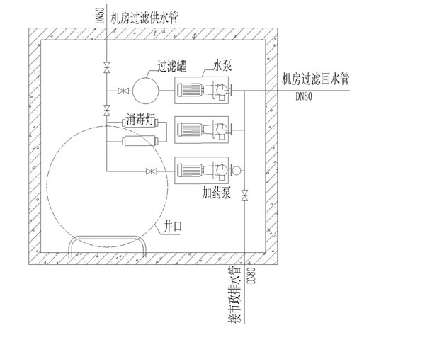 該方案泳池水循環(huán)一般采用順流式循環(huán),回水口設在池底,在池壁水面下0.5-1.0米處均勻布置出水口。保證水流分布均勻,無短流、渦流及死水域,循環(huán)周期8-10H,循環(huán)次數(shù)3-2.4。泳池消毒采用紫外線消毒,循環(huán)水經過消毒后進入泳池。過濾采用高速濾罐,僅在需要時才開啟過濾泵,水質達標時不開啟。采用計量加藥泵投加混凝劑,定量加入管網后從給水口加入泳池。