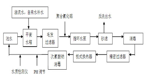 本設(shè)計泳池的進(jìn)回水方式,采用淺水端池壁進(jìn)水、深水端池底回水和池面排水相結(jié)合的順流循環(huán)方式,采用這種方式,既能有效去除沉積于底部的污物,又可去除浮于水面的毛發(fā)及其它輕質(zhì)漂浮物。保證了全池水質(zhì)的均勻。工藝流程圖如下圖所示: