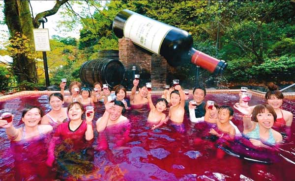 紅酒浴,紅酒有助于美容養(yǎng)顏、養(yǎng)氣活血,緩解皮膚松弛,紅酒對(duì)輕微貧血的女性有好處,促進(jìn)胃腸消化能力。躺在浴池中,有木有微醺的感覺(jué)呢。