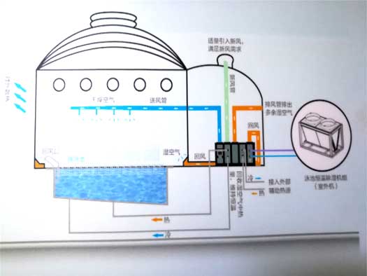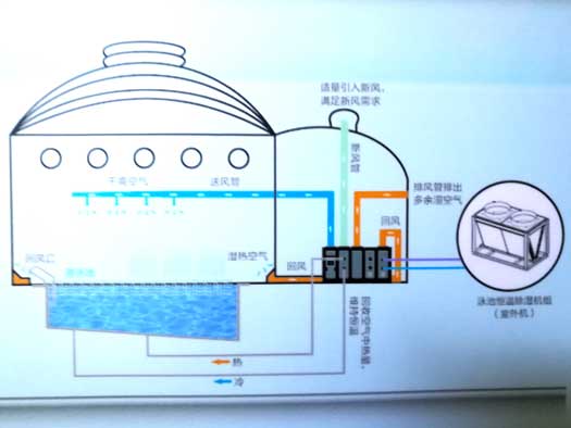 在夏季,需要進行空氣冷卻時,制冷劑就繞過再加熱盤管和池水冷凝器流向外機冷凝器,讓來自蒸發(fā)器的冷空氣給室內(nèi)游泳館提供干燥涼爽的空氣環(huán)境。