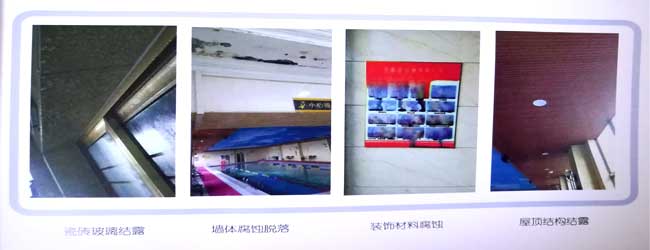 室內(nèi)泳池蒸發(fā)水汽中含有大量游離氯分子,吸附在建筑物上金屬結(jié)構(gòu)材料的表面,使金屬表面的保護(hù)膜破壞,在通過水的化學(xué)反應(yīng)導(dǎo)致金屬結(jié)構(gòu)腐蝕。