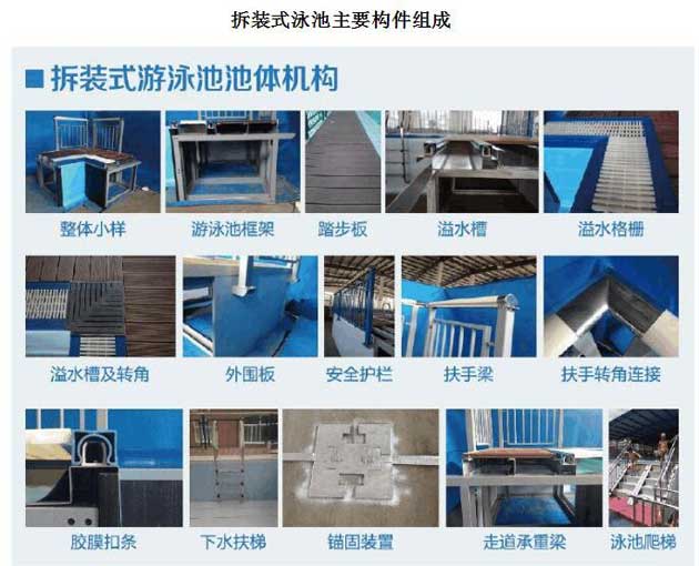 拆裝式游泳池又稱活動(dòng)泳池或拼裝式游泳池、拼裝泳池;也是近些年市場(chǎng)涌現(xiàn)出的一種新型游泳池產(chǎn)品。其原理是在工廠完成所有標(biāo)準(zhǔn)構(gòu)件的定制生產(chǎn)、采用現(xiàn)場(chǎng)拼裝作業(yè)方式完成各種規(guī)格游泳池設(shè)施的組裝建設(shè)。拆裝式游泳池可以根據(jù)用戶使用需求快速安裝于大多數(shù)符合要求的簡(jiǎn)單平整場(chǎng)地、相對(duì)于普通土建游泳池而言具有顯著的場(chǎng)地適應(yīng)性和反復(fù)安裝拆卸特性,故命名為拆裝式游泳池。按照國(guó)家標(biāo)準(zhǔn),拆裝式游泳池應(yīng)該能夠提供普通游泳場(chǎng)館的所有訓(xùn)練與比賽功能要求。