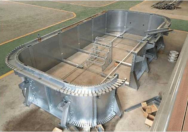 拆裝式泳池是由池體和游泳池水處理系統(tǒng)兩部分組成。池體由鋼架主體結(jié)構(gòu)、內(nèi)壁承壓防水、外壁裝飾、圍池過(guò)道、四周護(hù)欄等幾部分組成。一般拆裝式泳池池體的鋼構(gòu)采用Q-235型熱軋鋼框架結(jié)構(gòu),以高強(qiáng)度螺栓連接,鏈接螺栓為8.8級(jí),M-14。鋼結(jié)構(gòu)框架、鋼結(jié)構(gòu)溢水槽經(jīng)過(guò)鍍鋅防腐處理,表層還有兩層防腐處理,一層防銹,二層防腐。溢水槽上方一般鋪設(shè)溢水格柵,常用寬度規(guī)格有250mm、300mm、400mm等幾種,可根據(jù)不同需要進(jìn)行選擇。內(nèi)壁承壓板一般為300mm*30mm、單皮厚度為2.5mm的PVC中空板材或者1.5mm的鍍鋁鋅鋼板,泳池防水層厚度為1.2mm的具有抗拉加強(qiáng)筋的進(jìn)口泳池專(zhuān)用膠膜組成,且膠膜采用高頻焊接制作。外壁裝飾和圍池過(guò)道均由優(yōu)質(zhì)pvc材料制作而成,美觀耐用。四周護(hù)欄采用不銹鋼或者碳鋼噴涂材料制成。泳池水處理系統(tǒng)根據(jù)泳池蓄水量配置,處理效果可達(dá)到《國(guó)際泳聯(lián)(FINA)游泳池水質(zhì)衛(wèi)生標(biāo)準(zhǔn)》。