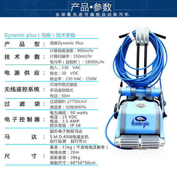 海豚2002全自動泳池吸污機(jī)采用帶過濾功能的吸污過濾袋,自動程式化工作,適用不同大小的泳池使用。休積細(xì)小,輕巧及操作容易。帶推車,便于使用及收藏。獨(dú)立設(shè)備,無需安裝。