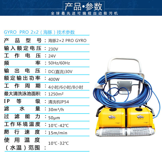 海豚2×2游泳池吸污機(jī)獨(dú)立操作,耗電量低,清掃、洗刷、過濾讓您的泳池清潔無后顧之憂,集新性能與改進(jìn)性能于一體,可完成擦洗、清掃、真空吸附及過濾工作,使你的泳池清澈見底。